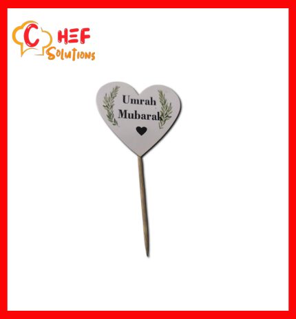 Heart-shaped “UMRAH MUBARAK” cake topper or cupcake pick attached to a small wooden stick.Â