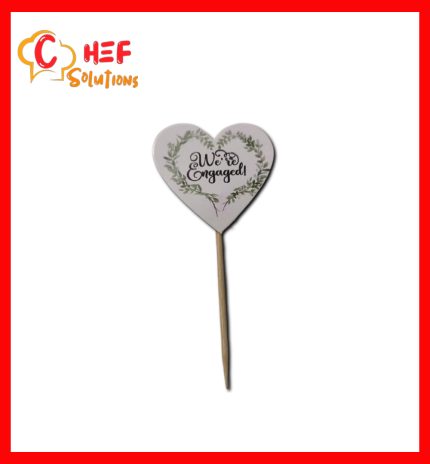 Heart-shaped “We’re Engaged” cake topper or cupcake pick attached to a small wooden stick.Â