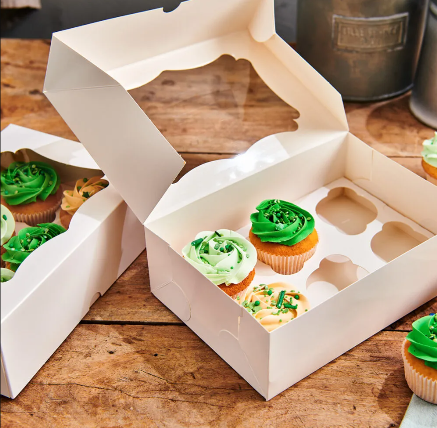 A 6-cupcake window box is a rectangular cardboard container with a clear top window, an internal divider for stability, and a secure latch, designed to hold and display six cupcakes or muffins for transport. These boxes are typically made of food-grade paper or board, are easy to assemble, and are popular for home bakers and professional bakeries for events, gifts, or take-away orders.Â