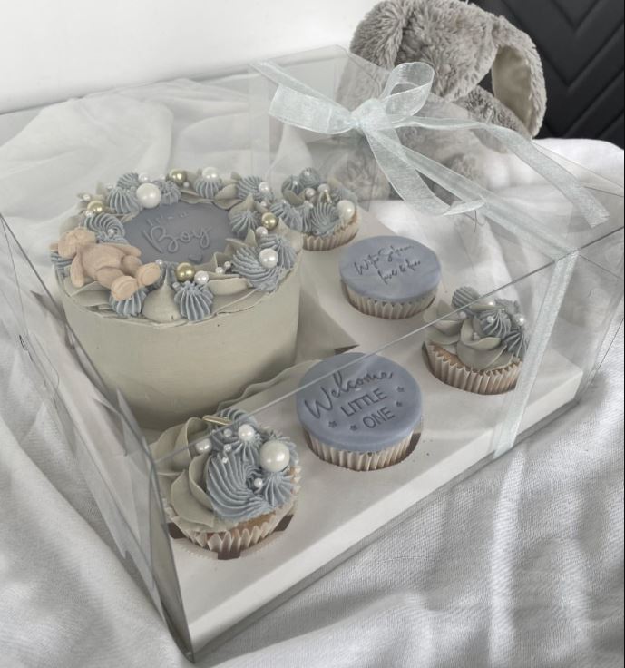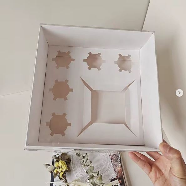 The box and its insert are designed to hold the cake and cupcakes securely, minimizing the risk of damage during transport or handling.