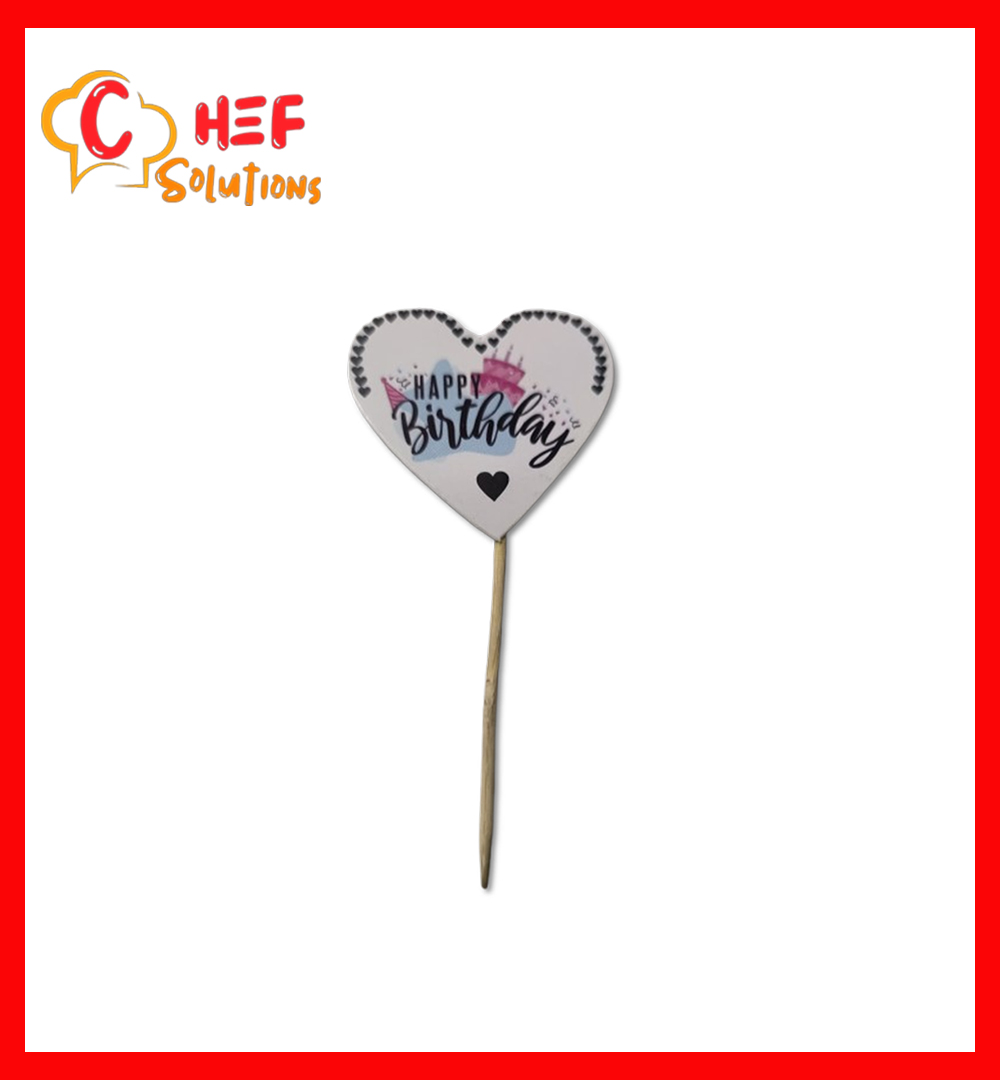 Heart-shaped “Happy Birthday” cake topper or cupcake pick attached to a small wooden stick.Â