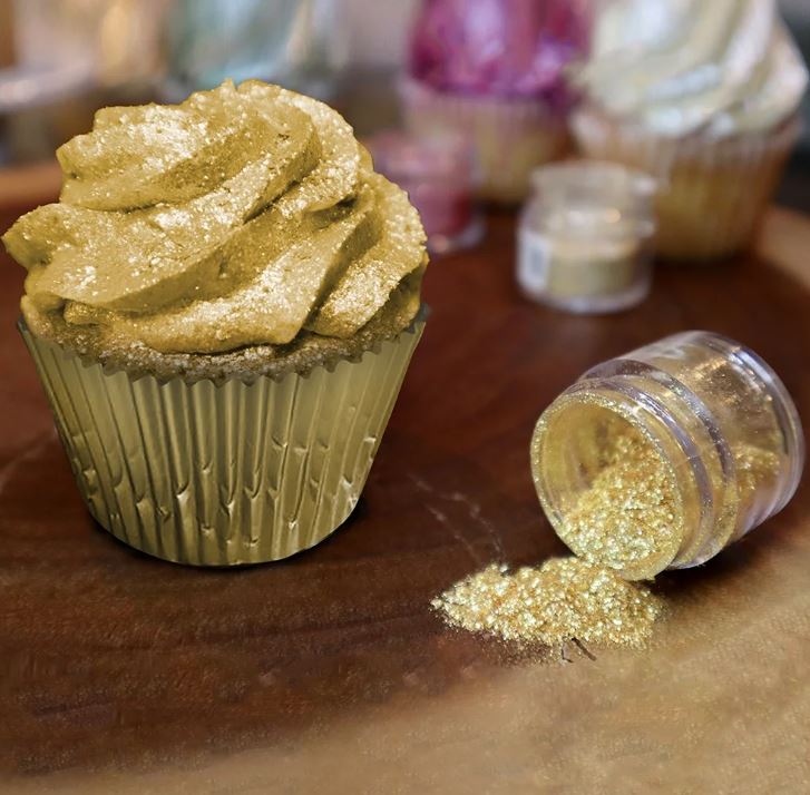 Vibgyor Luminous Gold Edible dust, which is a food coloring product used for confectionery and baking.  It is a high-quality, edible