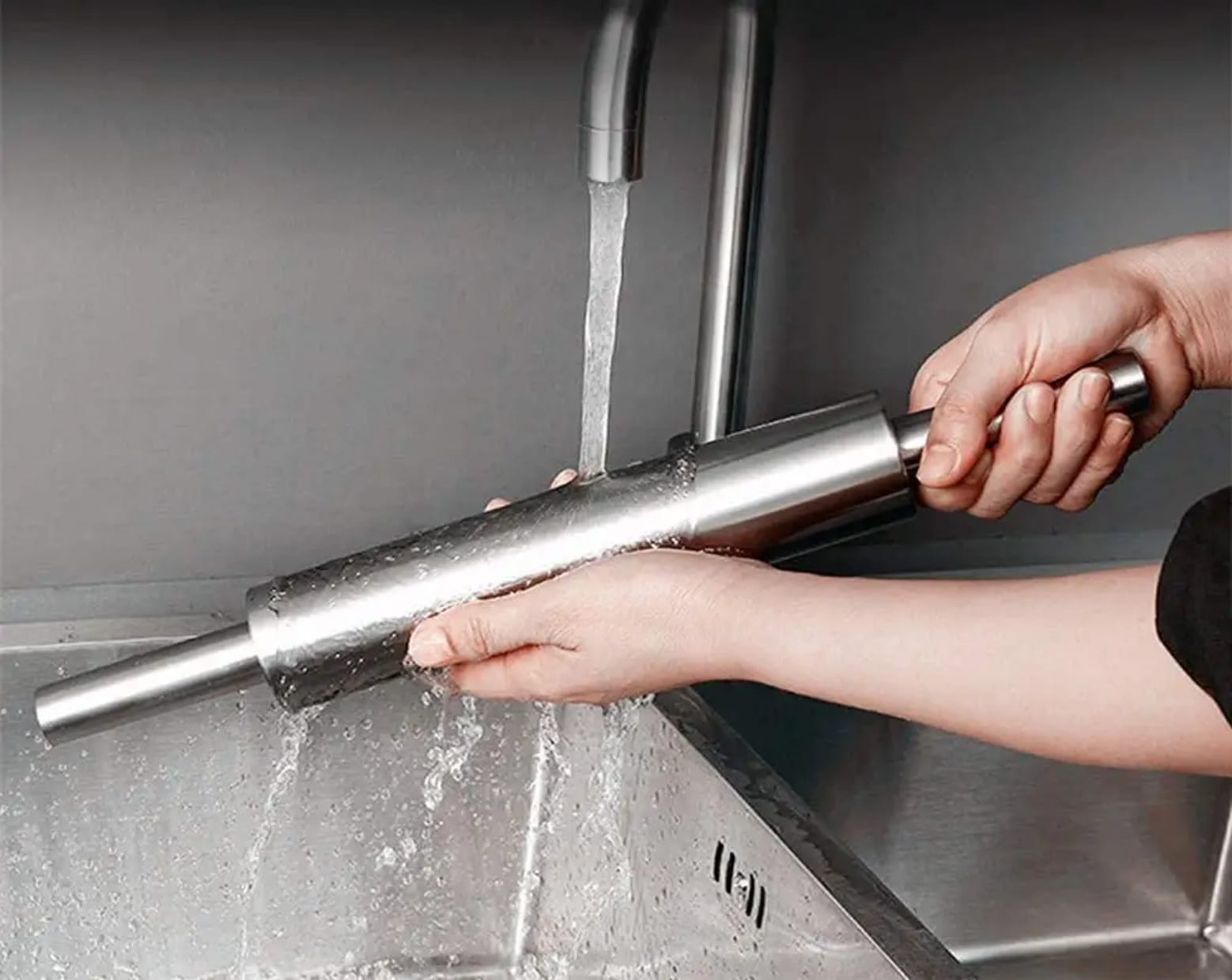 Generally easy to clean with warm soapy water and a simple wipe. Many stainless steel rolling pins are also dishwasher safe