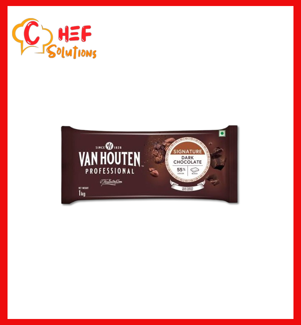Van Houten Professional Signature Dark Chocolate 55%, a 1kg block of dark chocolate. It is described as a couverture chocolate with a well-balanced flavor profile.
